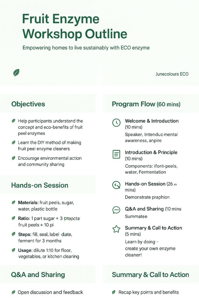 Junecolours ECO was founded after an inspiring experience in community environmental work. Our founder learned the importance of recycling and living sustainably through eco education activities. While learning to make eco enzymes, she discovered that fruit peels and vegetable scraps can be transformed into natural cleaning solutions – a simple way to keep our homes clean while protecting the Earth.